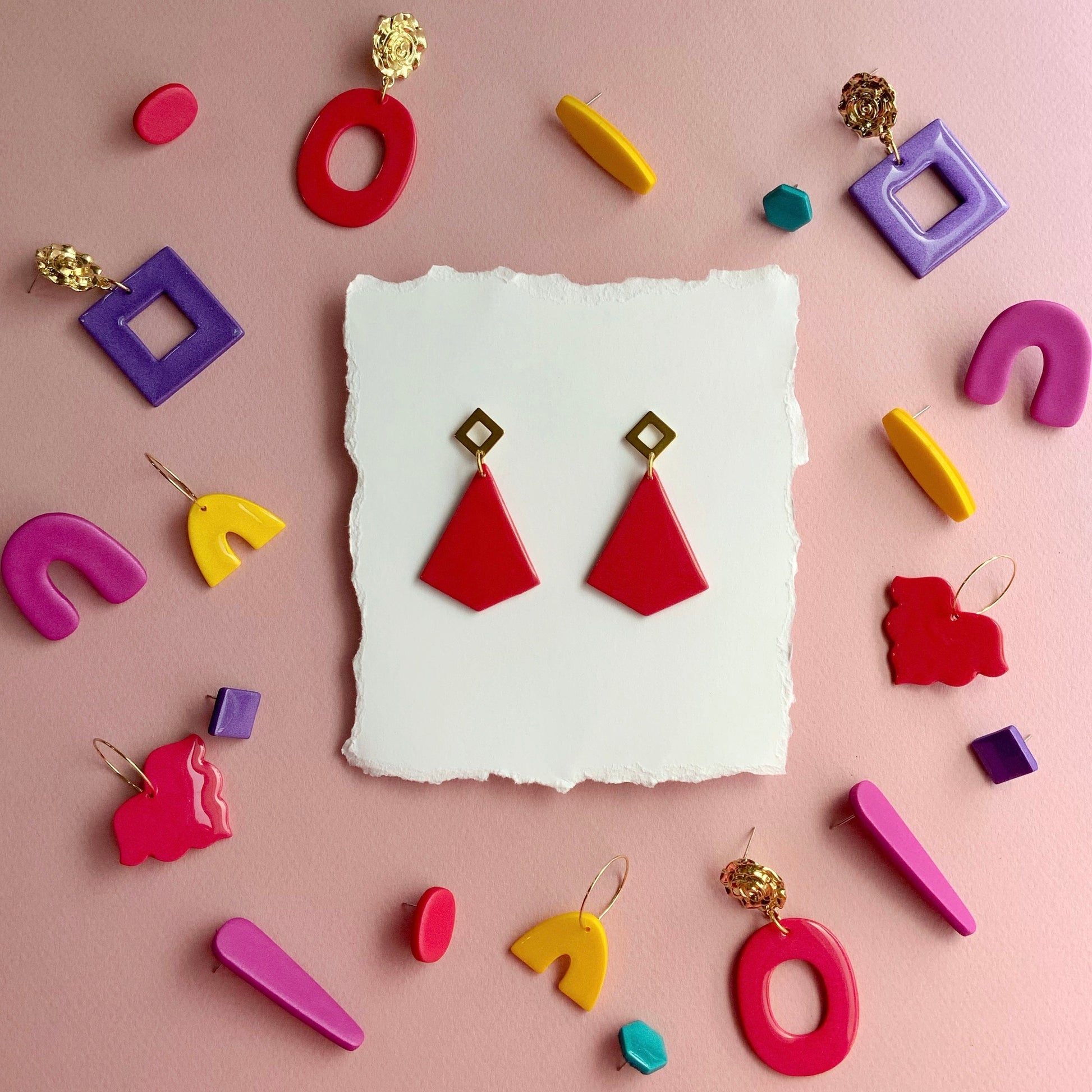 Crafted with a durable brass post, these Cherry Triangle Dangles showcase a deep cherry hue enhanced by a glossy resin coating. The resin finish not only adds a captivating shine but also protects the earrings, ensuring long-lasting wear. Their sleek triangular shape offers a contemporary aesthetic ideal for elevating any outfit with understated sophistication.