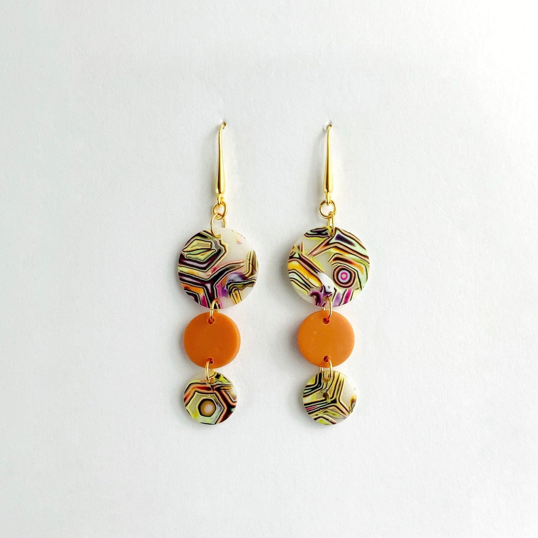 These Circle Row Mokume Gane earrings feature durable stainless steel hooks for secure wear. Their vibrant, fun colors highlight the unique mokume gane design, offering a stylish yet comfortable accessory ideal for daily use or special occasions.