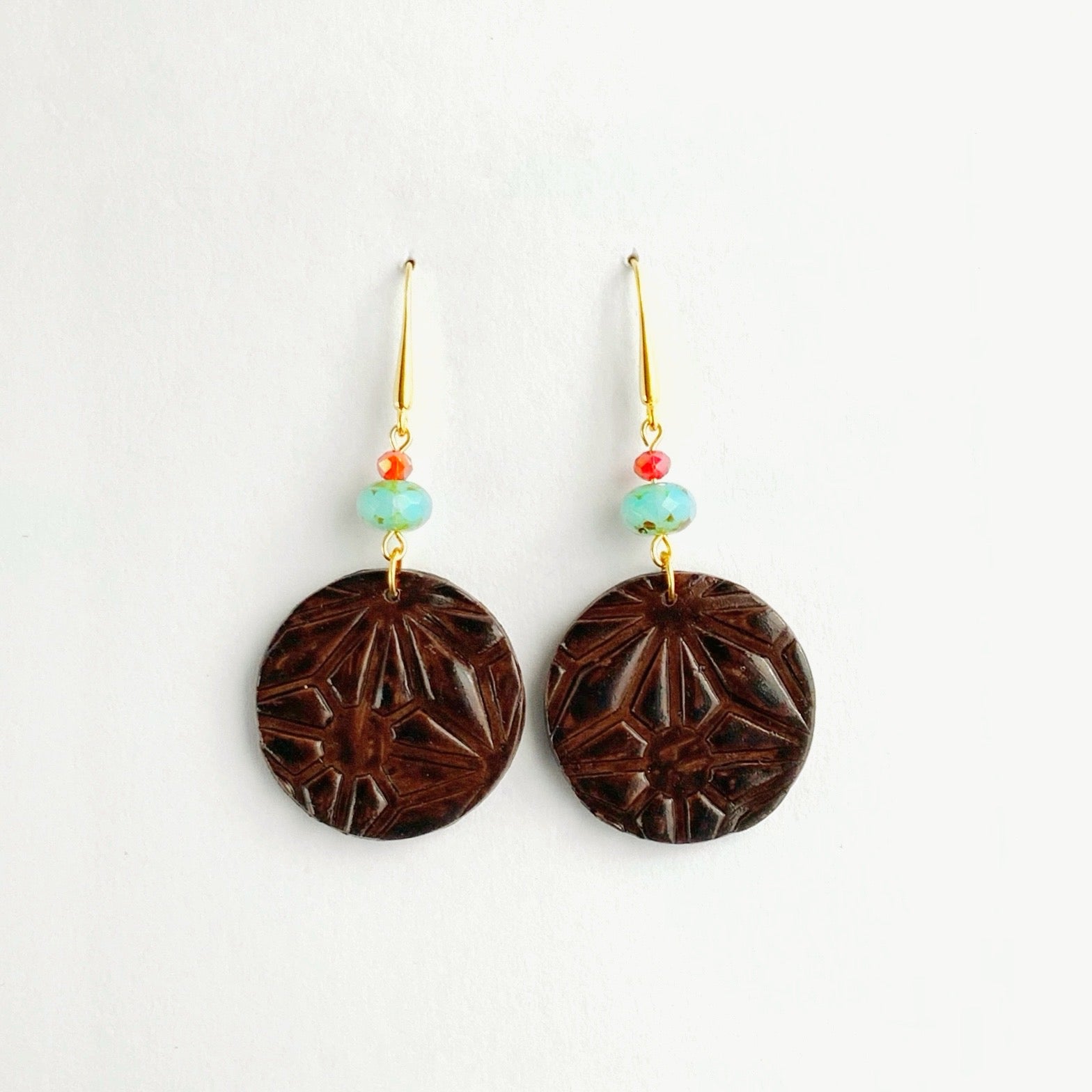 Textured Faux Wood Circle Earrings-Glass Beads