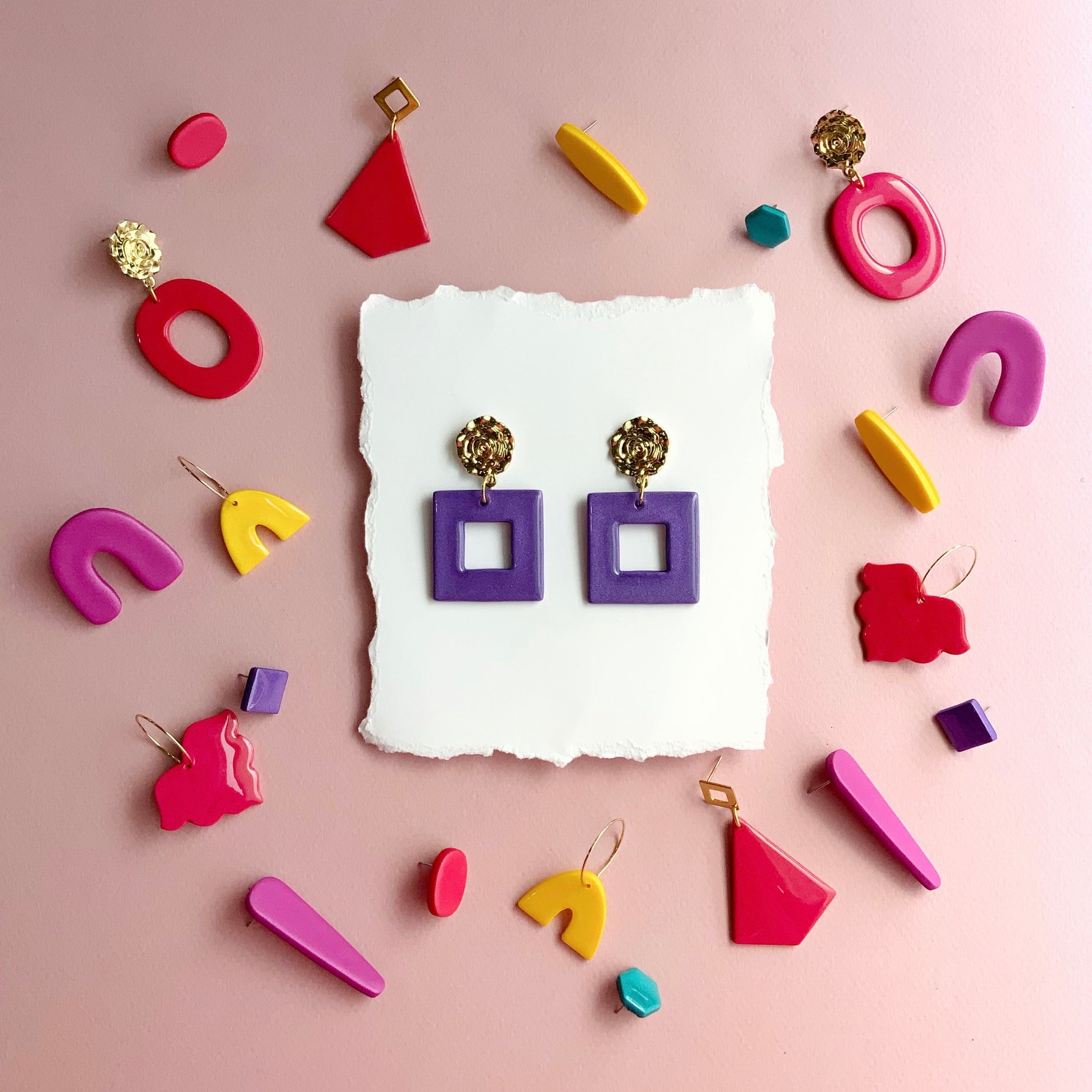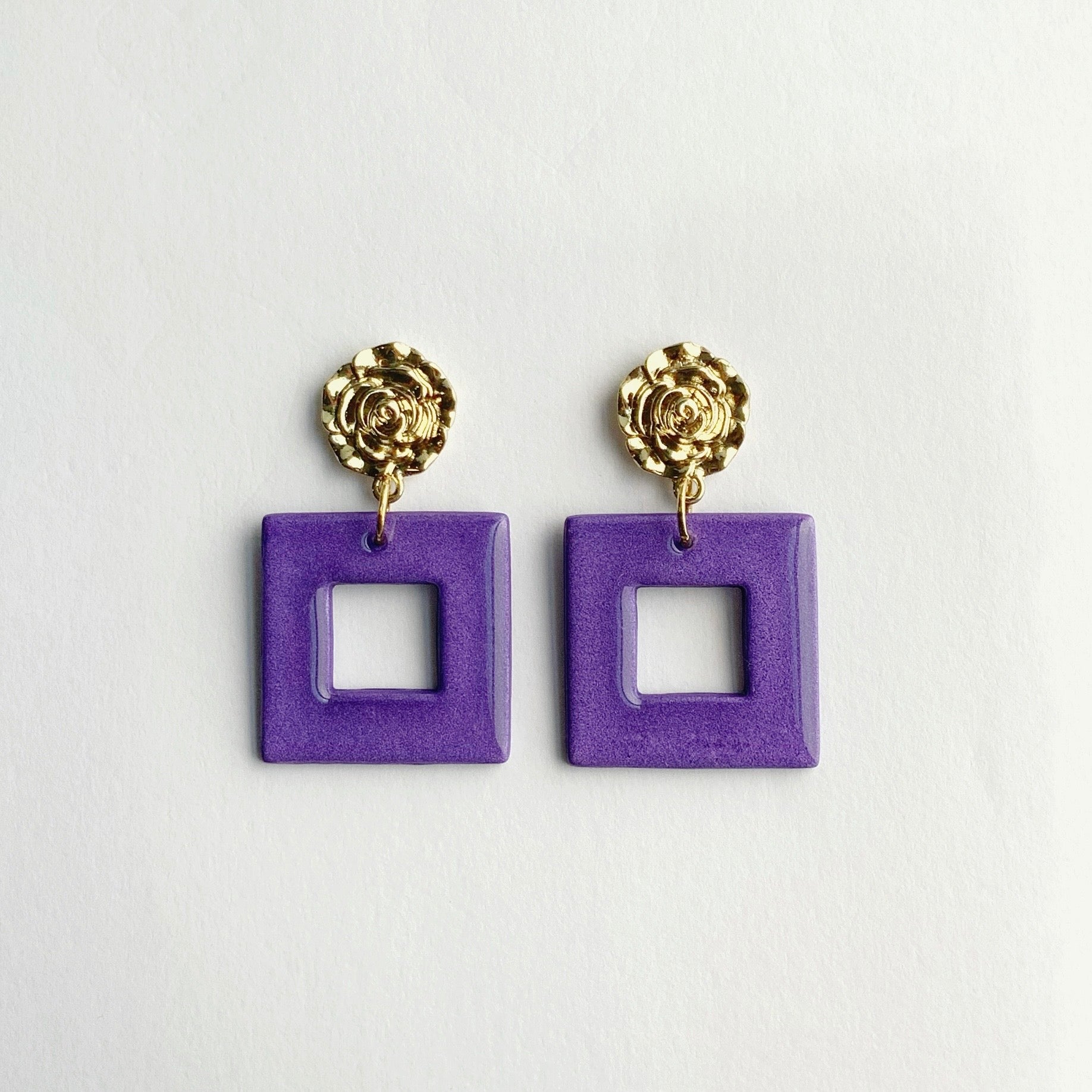 Crafted with a durable brass post, these purple square dangles showcase a deep purple hue enhanced by a glossy resin coating. The resin finish not only adds a captivating shine but also protects the earrings, ensuring long-lasting wear. Their sleek square shape offers a contemporary aesthetic ideal for elevating any outfit with understated sophistication.